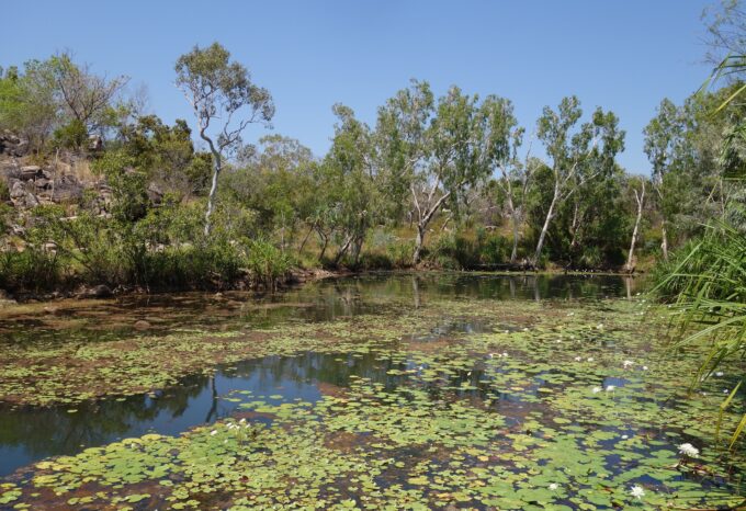 L’environnement de la King Edward River est vraiment joli. Des pierres tapissent le fond de la rivière et la végétation verdoyante prend des airs de forêt tropicale avec les palmiers.