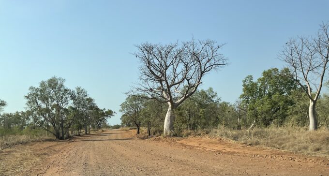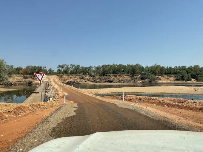 En janvier 2023 le seul pont sur la route principale de la région des Kimberley a été détruit lors d’inondations dévastatrices, laissant ainsi les habitants isolés et livrés à eux même pendant plusieurs jours. La reconstruction du nouveau pont n’est pas achevée au moment où nous passons il devrait rouvrir à la circulation en fin d’année.