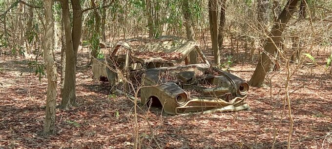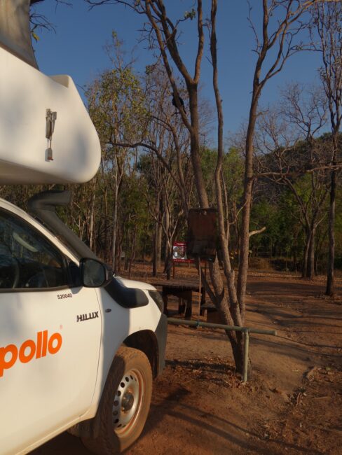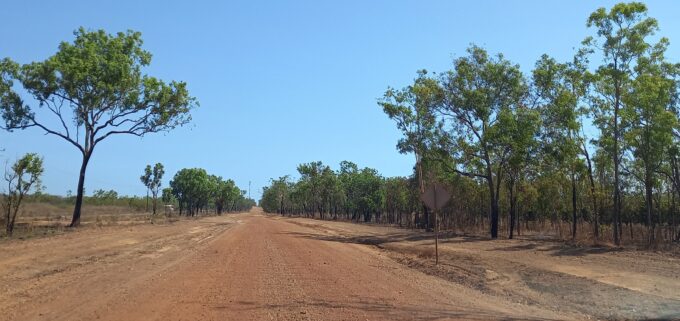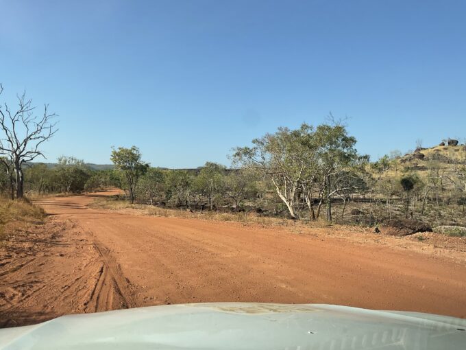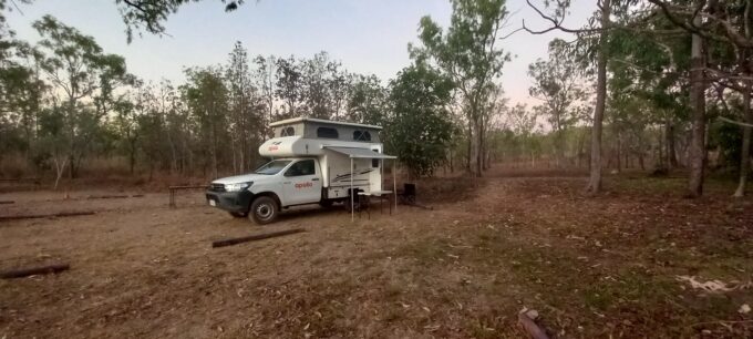 Une fois le 4X4 récupéré à l’agence de location, nous “dévalisons” le supermarché en vue de la rareté des villes et supermarchés qui seront sur notre route. Nous roulons vers l’est pendant 1h30 sur Arnhem Highway puis bifurquons sur la piste de 4 kms en direction du camping “Purple Mango café”.