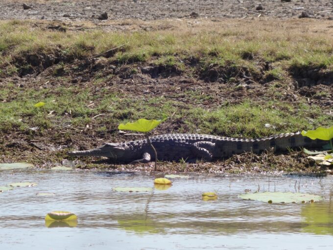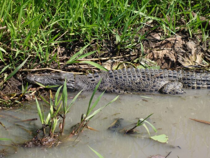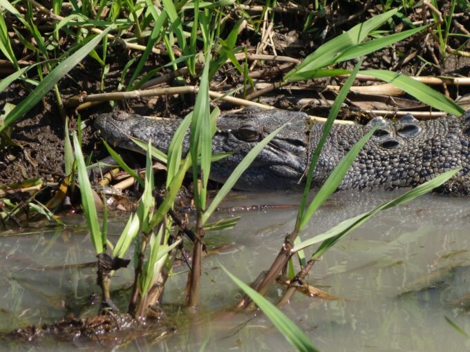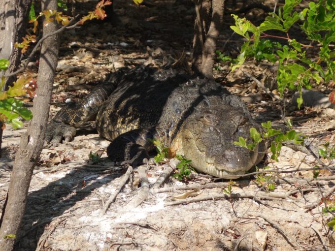 Les salties ou crocodiles d’estuaire sont les plus agressifs. Ils vivent dans les eaux douces mais aussi dans les eaux salées le long de la côte nord de l’Australie. Ils peuvent rester sous l’eau jusqu’à 7h et ont donc le temps de choisir leur proie. Celui ci est de bonne taille il donne l’impression de digérer tranquillement son précédent repas mais bon méfiance…il a les dents longues et l’œil glauque!