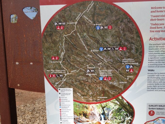 Au milieu de l’après midi nous roulons pendant 25kms sur la Gimbat road et la Gunlom road pour rejoindre le camping de Gunlom. Nous avons prévu une bonne douche et le lendemain baignade dans la cascade. Sauf que surprise arrivés au bout de la piste c’est fermé alors qu’au début de Gimbat road le panneau indiquait ouvert. Il est déjà 17h et à moins de 2h d’ici il n’y a aucun camping. Pas le choix que de dormir dans une aire de repos au milieu de nulle part et où nous sommes seuls.