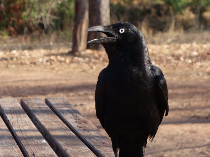 Un corbeau nous tient compagnie le temps de notre dîner au cas où quelque chose lui tomberait dans le bec